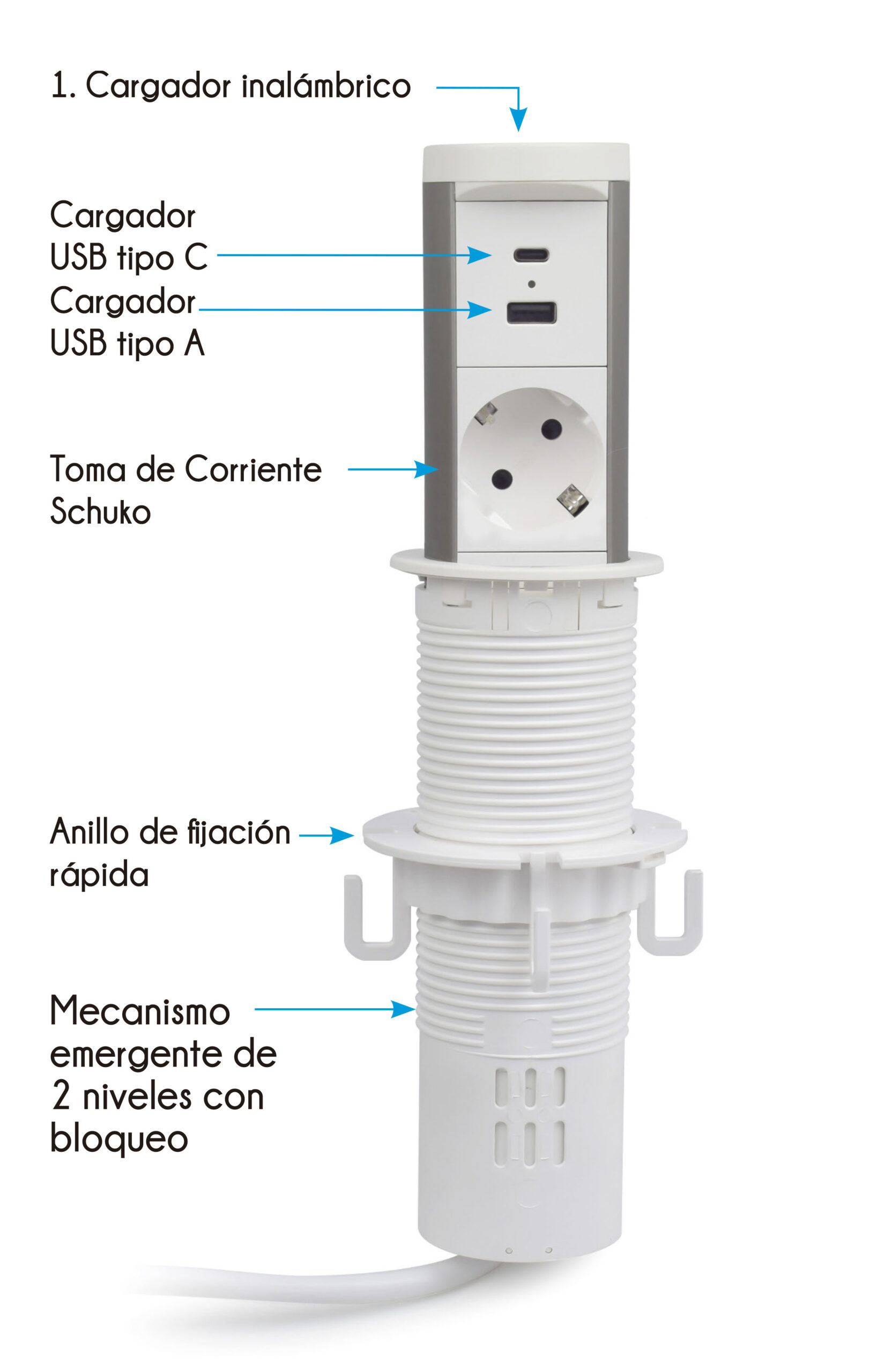 1 enchufe Schuco + 1 Puerto USB tipo A + 1 Puerto USB tipo C + Tapa de carga inalámbrica.
